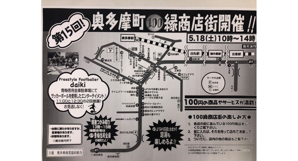 各店舗100縁(円)の商品が目玉となり、青梅からも多数の出店があります✨