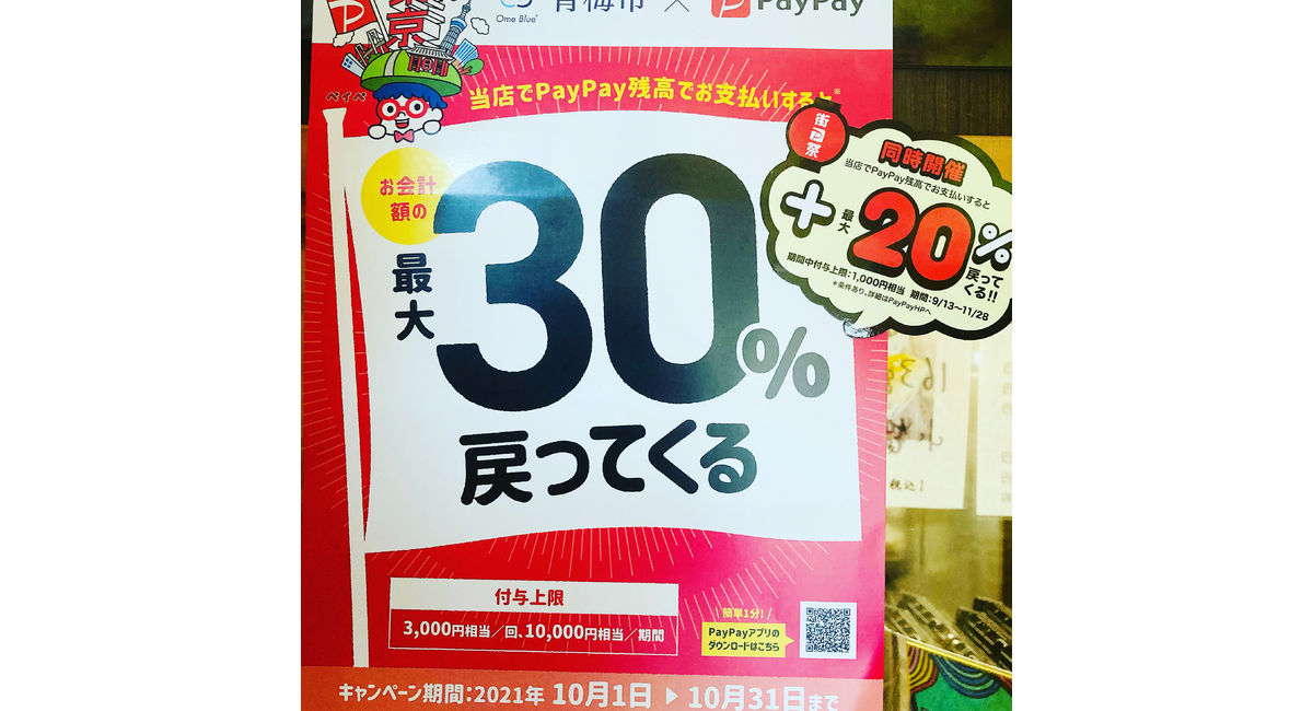 只今、 PayPay残高払いで最大30%戻ってくるキャンペーンと、『街ペイ祭』最大20%戻ってくるで、最大50%戻ってくる、ダブルキャンペーン中‼️