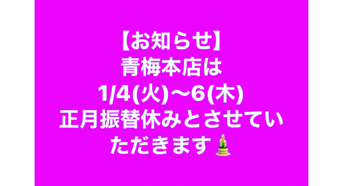 本日1/4(火)〜6(木)まで、振替休業とさせていただきます‼️