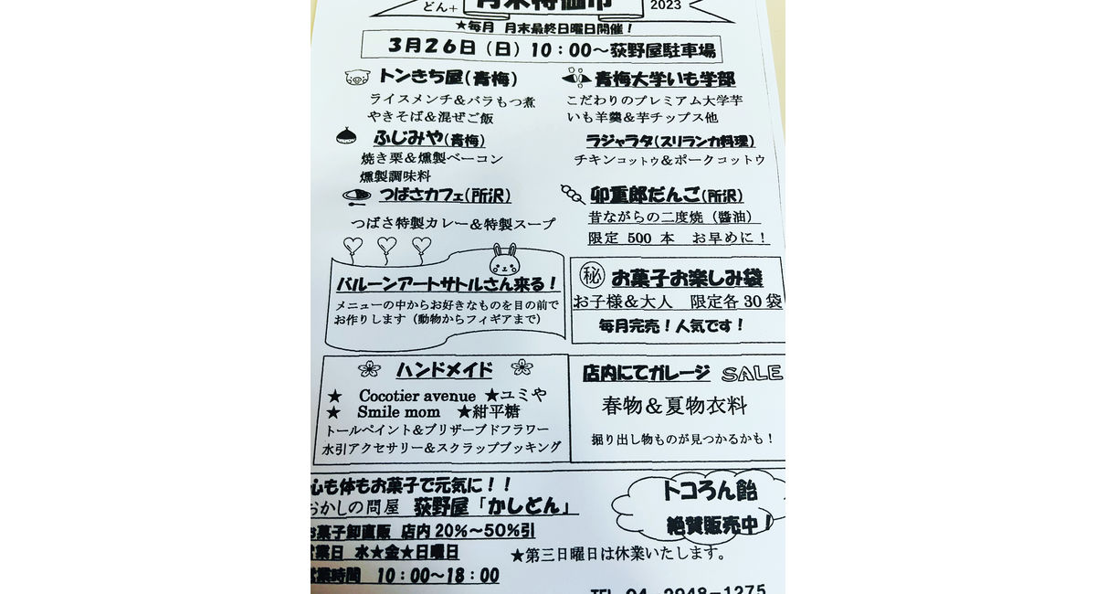 3/26(日)は、所沢市にありますお菓子問屋のおぎのや様の今年最初の『月末特価市』に雨予報にもメゲズに出店します‼️