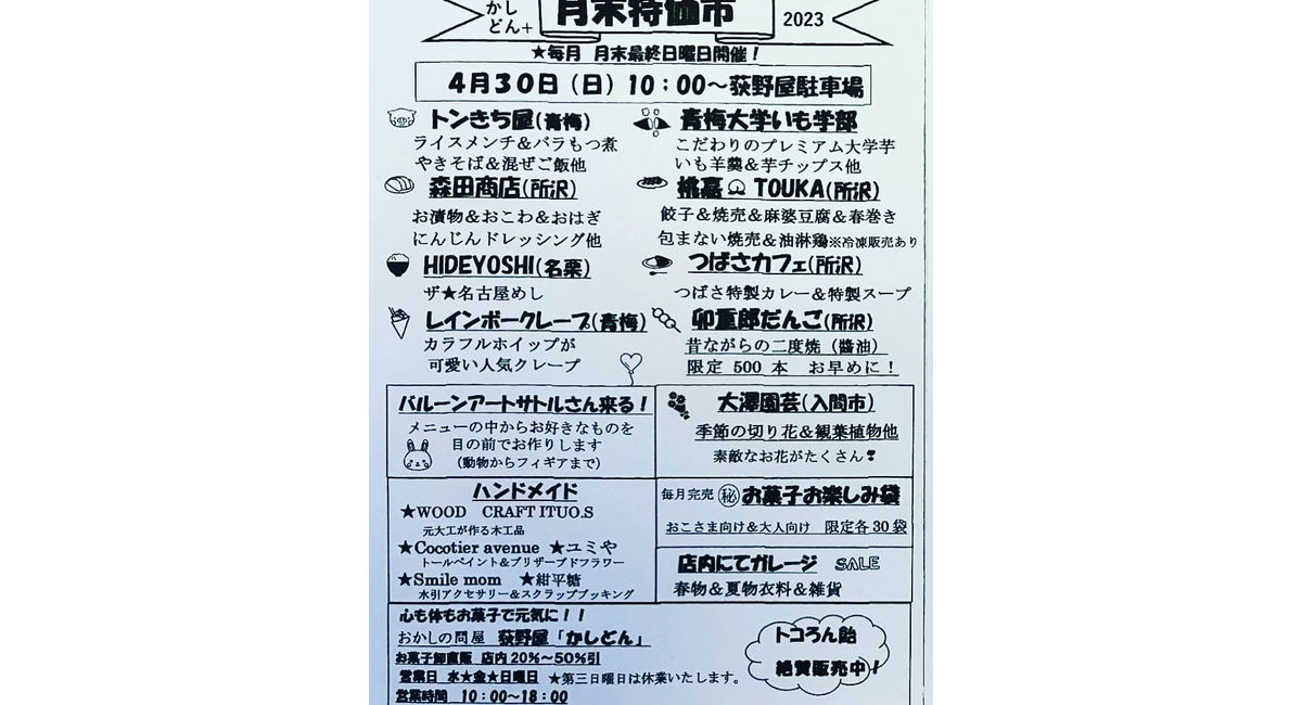 4/30(日)は、所沢市にありますお菓子問屋のおぎのや様の今年最初の『月末特価市』に今回も雨予報にもメゲズに出店します‼️