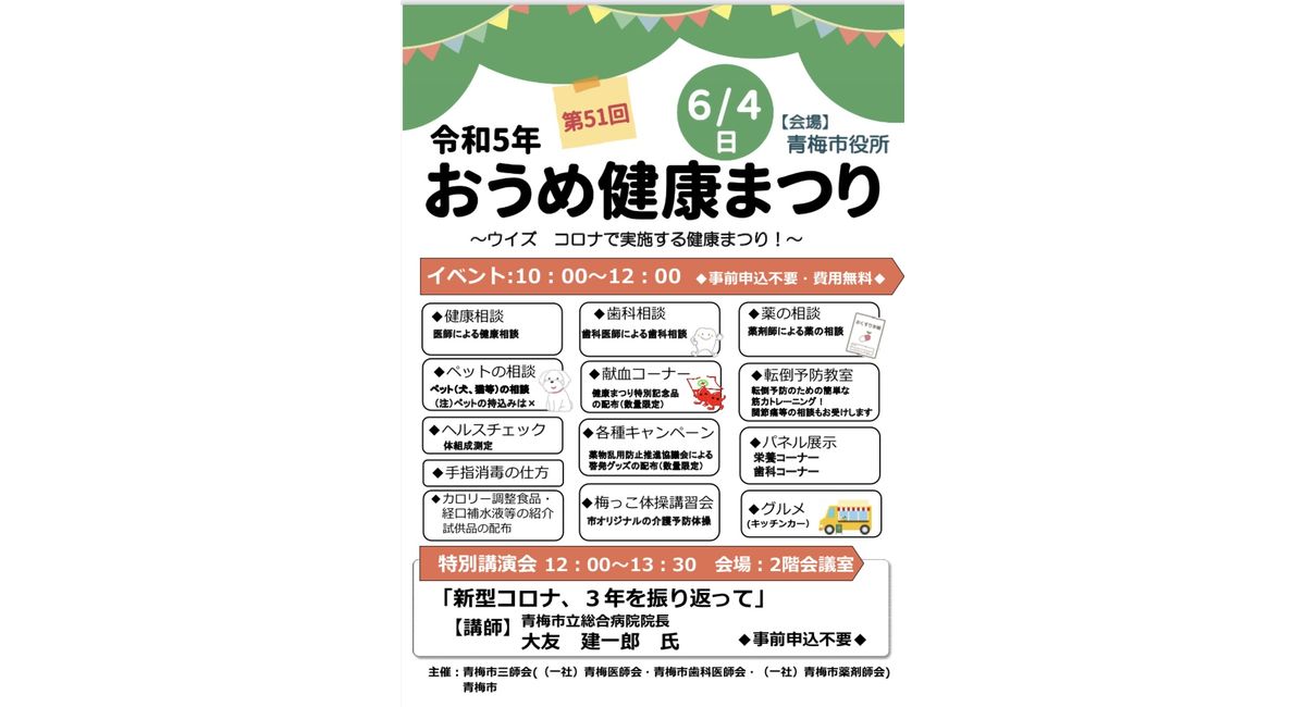 6/4(日)は青梅市役所で行われる『おうめ健康まつり』(10時〜14時)に出店します‼️