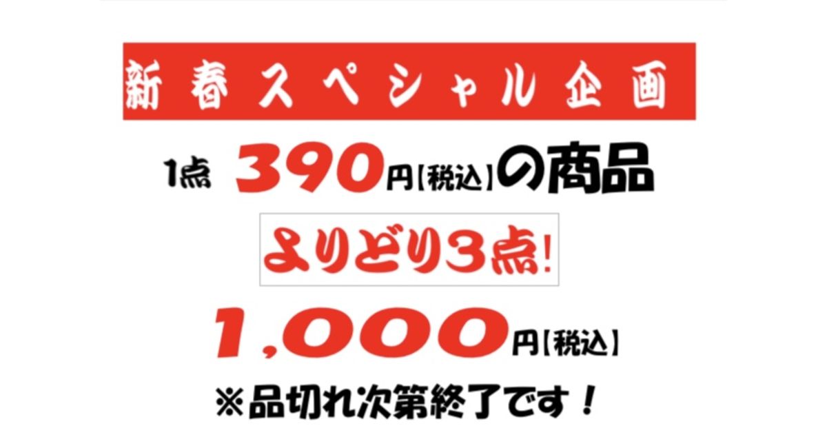 お知らせしました通り、今年に続き福袋を限定販売しますが、さらに店頭にて1点390円均一セール、さらによりどり3点1000円にて大放出しますので、是非ご利用ください✨