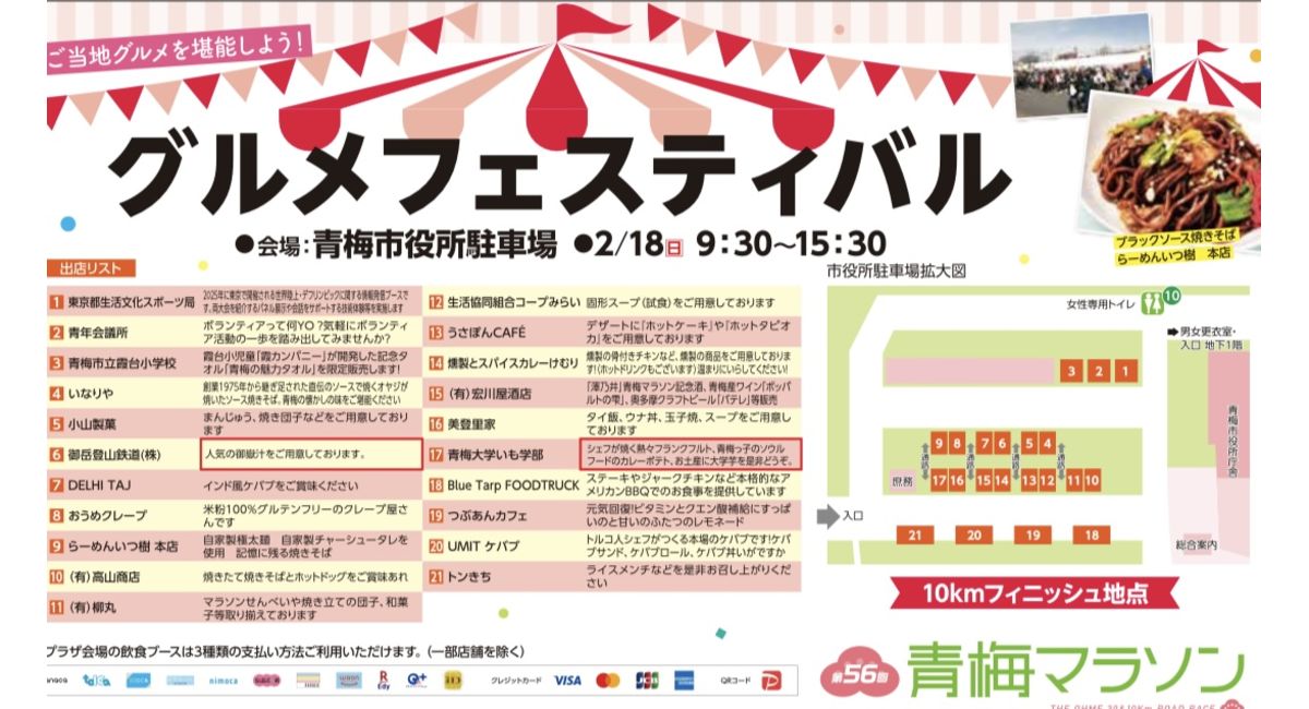 まずは10kmの部スタート&ゴール地点である青梅市役所で行われる『グルメフェスティバル』(9時半〜15時半)‼️