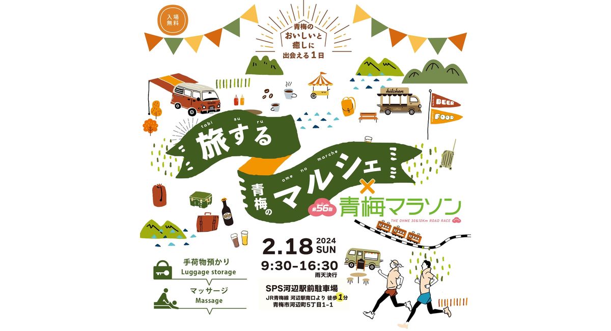 30kmの部スタート&ゴール地点のあるJR河辺駅南口SPS河辺駅前駐車場で初めて行われる『旅する青梅のマルシェ』(9時半〜16時半)に出店します✨