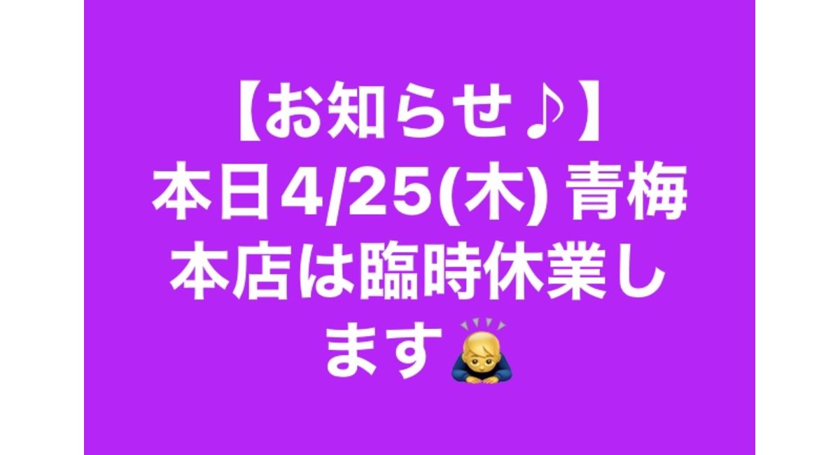 本日4/25(木)青梅本店は、誠に勝手ながら臨時休業させていただきます‼️