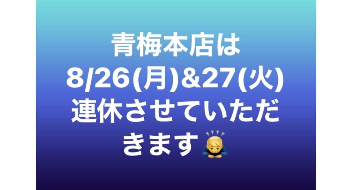 青梅本店は8/26(月)&27(火)連休させていただきます🙇♂️