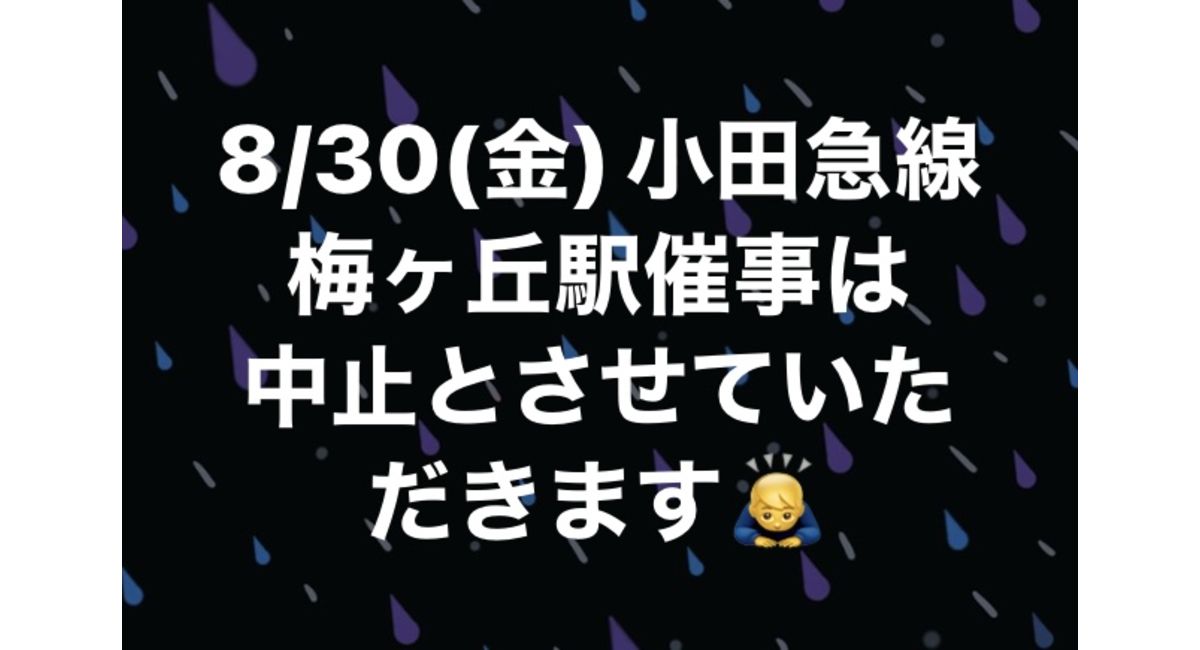 明日8/30(金)予定しておりました小田急線梅ヶ丘駅催事は、台風10号による風雨の影響を考慮しまして、大変申し訳ございませんが、中止とさせていただきます🙇♂️