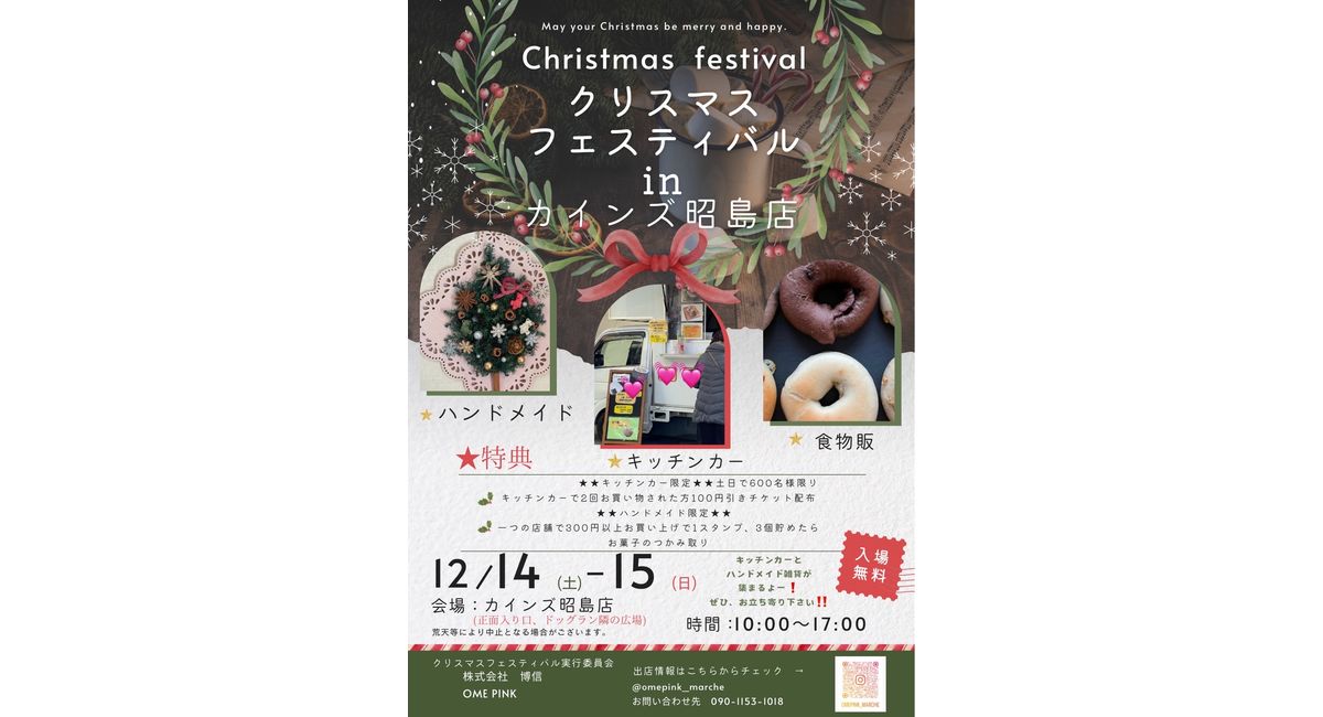 12/15(日)は、2024年最後のビッグイベントとなります『クリスマスフェスティバルinカインズ昭島店』に出店します‼️
