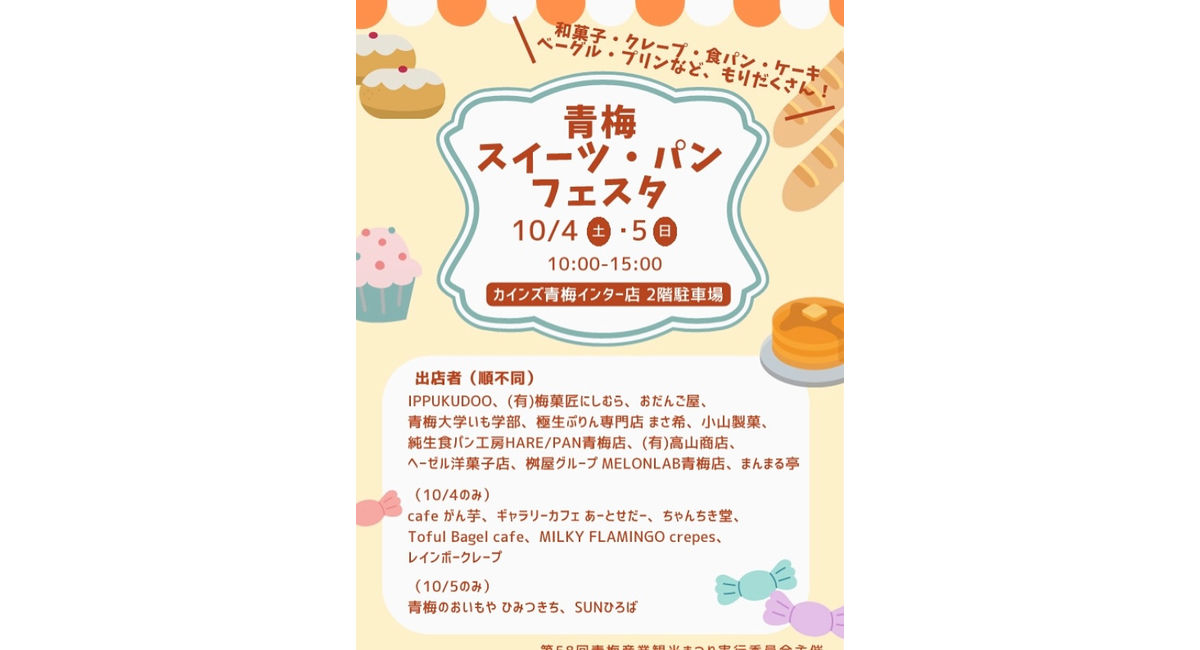 10月最初のビッグイベント第一弾、10/4(土)&5(日)カインズホーム青梅インター店(2F駐車場)で開催される恒例になりました『青梅スイーツ・パンフェスタ』に出店します‼️