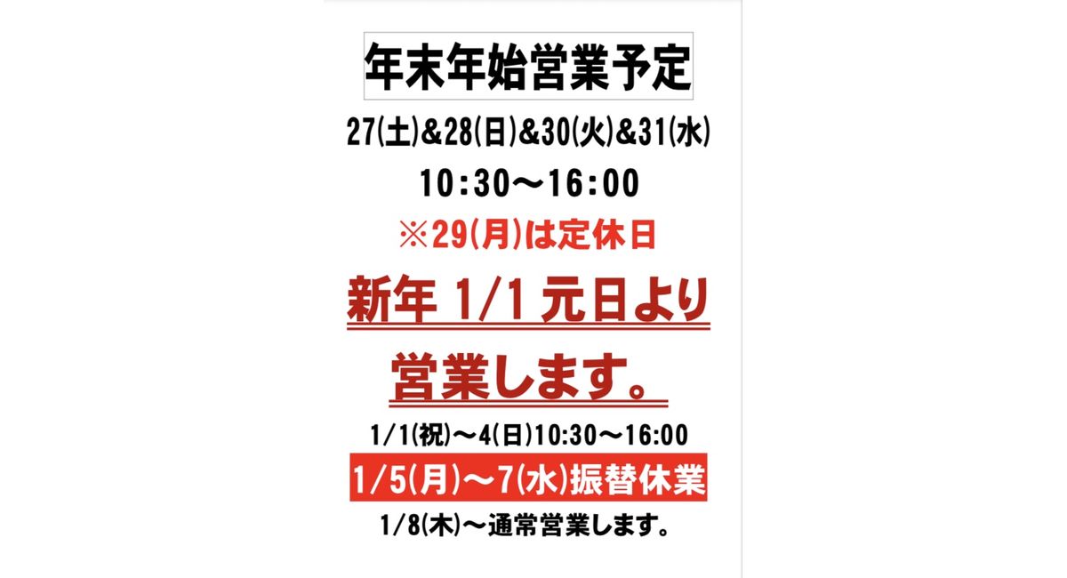 年内は29日(月)のみ定休日、その前後27日(土)〜31日(水)は10時30分〜16時まで営業いたします💡