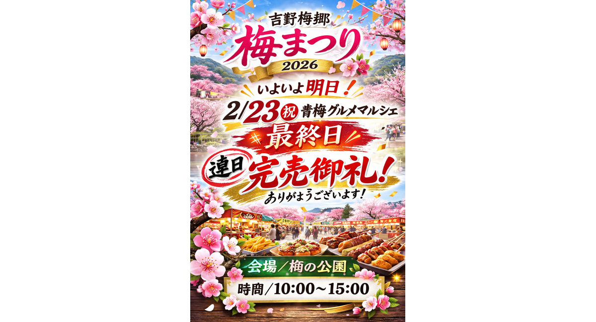 いよいよ明日2/23㊗︎吉野梅郷梅まつり『青梅グルメマルシェ』(梅の公園10時〜15時)最終日となります‼️