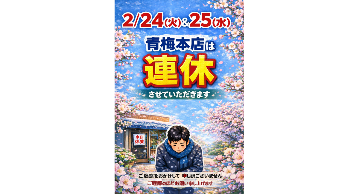さて青梅本店は、誠に勝手ながら2/24(火)&25(水)は振替連休させていただきます🙇♂️