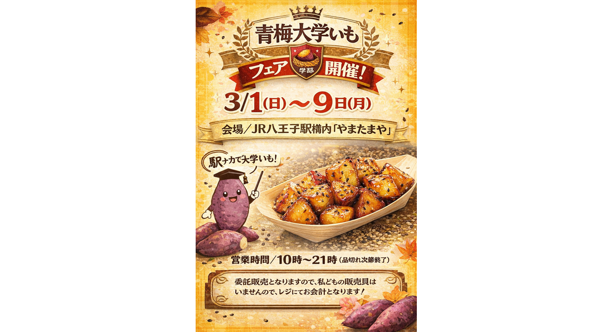 3/1(日)〜9(月)の九日間、JR八王子駅コンコースにあります『やまたまや』にて『青梅大学いもフェア』を開催させていただきます‼️