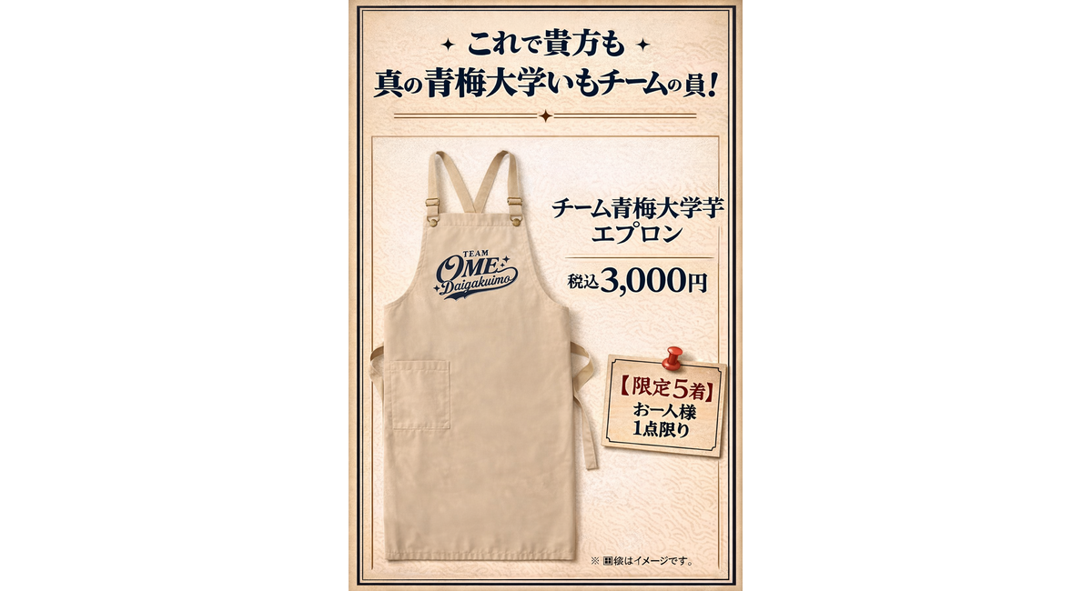 先日発表しましたアパレル事業『TEAM OMEDAIGAKUIMO』ですが、第一弾のエプロンが完成しました‼️