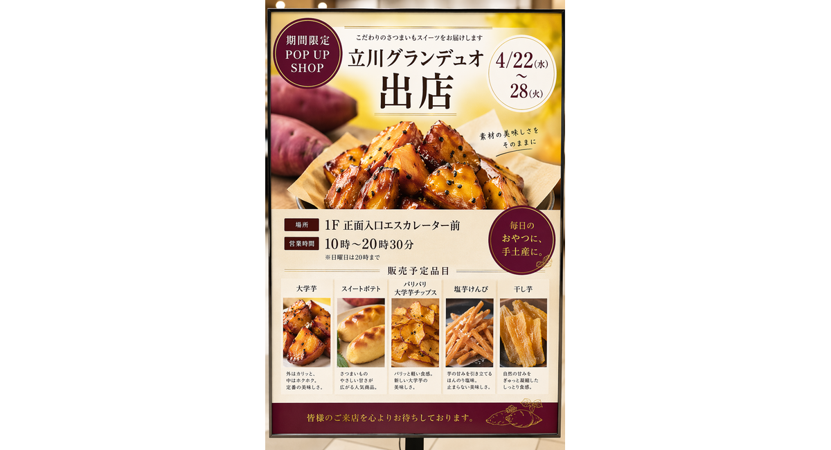 今回の予定ラインナップは、プレミアム大吟醸大学芋、シルクスイート大学芋、パリパリ大学芋チップス、スイートポテト極、塩芋けんぴ、干し芋になります🍠