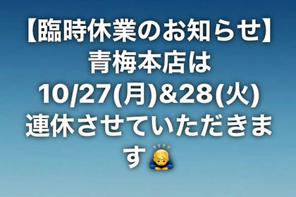 • 青梅本店は10/27(月)&28(火)連休します♪