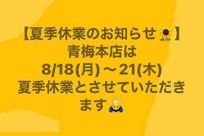 いつもご愛顧ありがとうございます✨   青梅本店は8/17(月)〜21(木)の四日間、夏季休業とさせていただきます🙇‍♂️   8/22(金)から週末まで通常営業させていただきますので、よろしくお願いいたします💡 ...